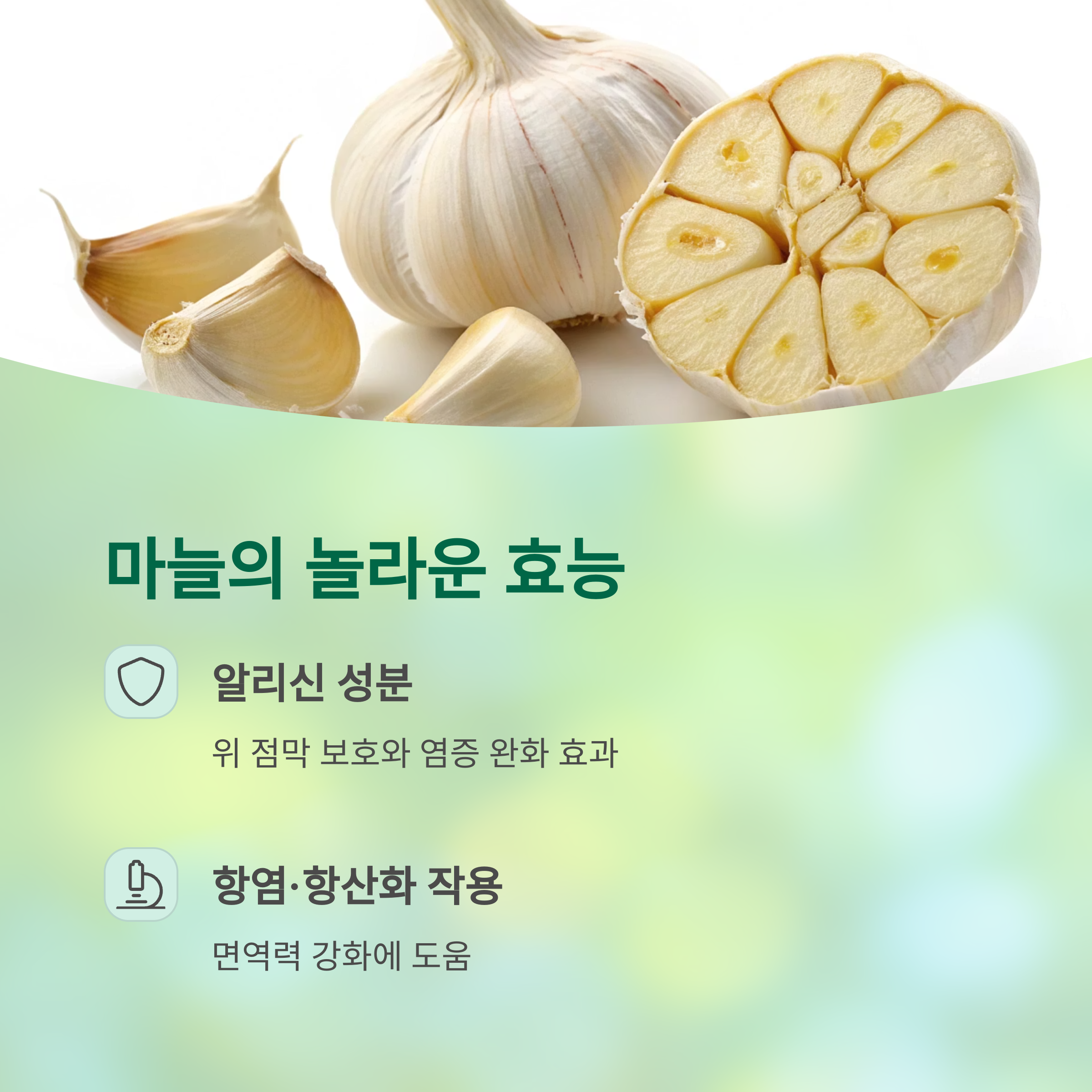 | 마늘 | 알리신 | 항균 작용, 위 점막 보호 |