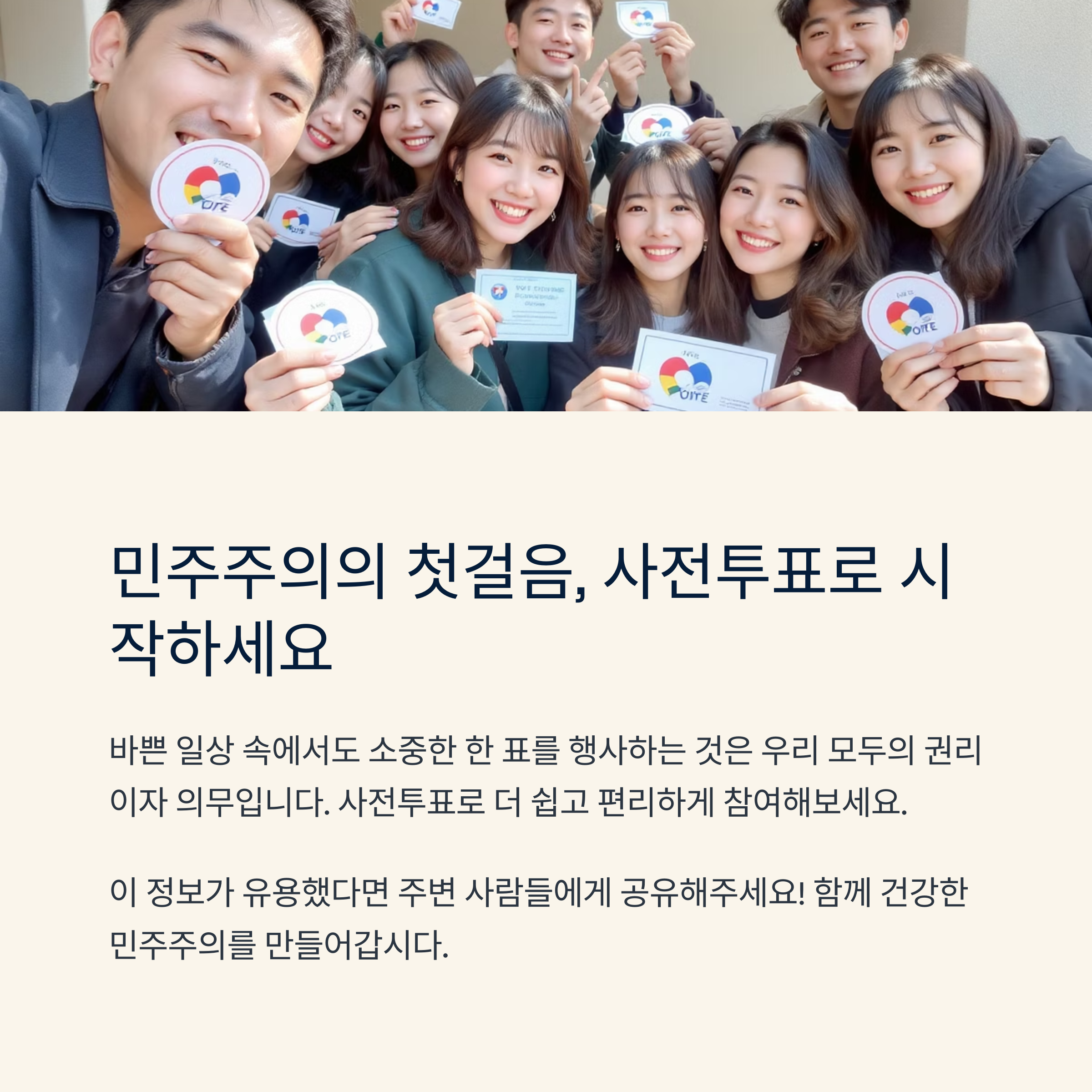 사전투표는 우리 모두의 소중한 권리를 보다 간편하고 효과적으로 행사할 수 있는 훌륭한 제도입니다.
