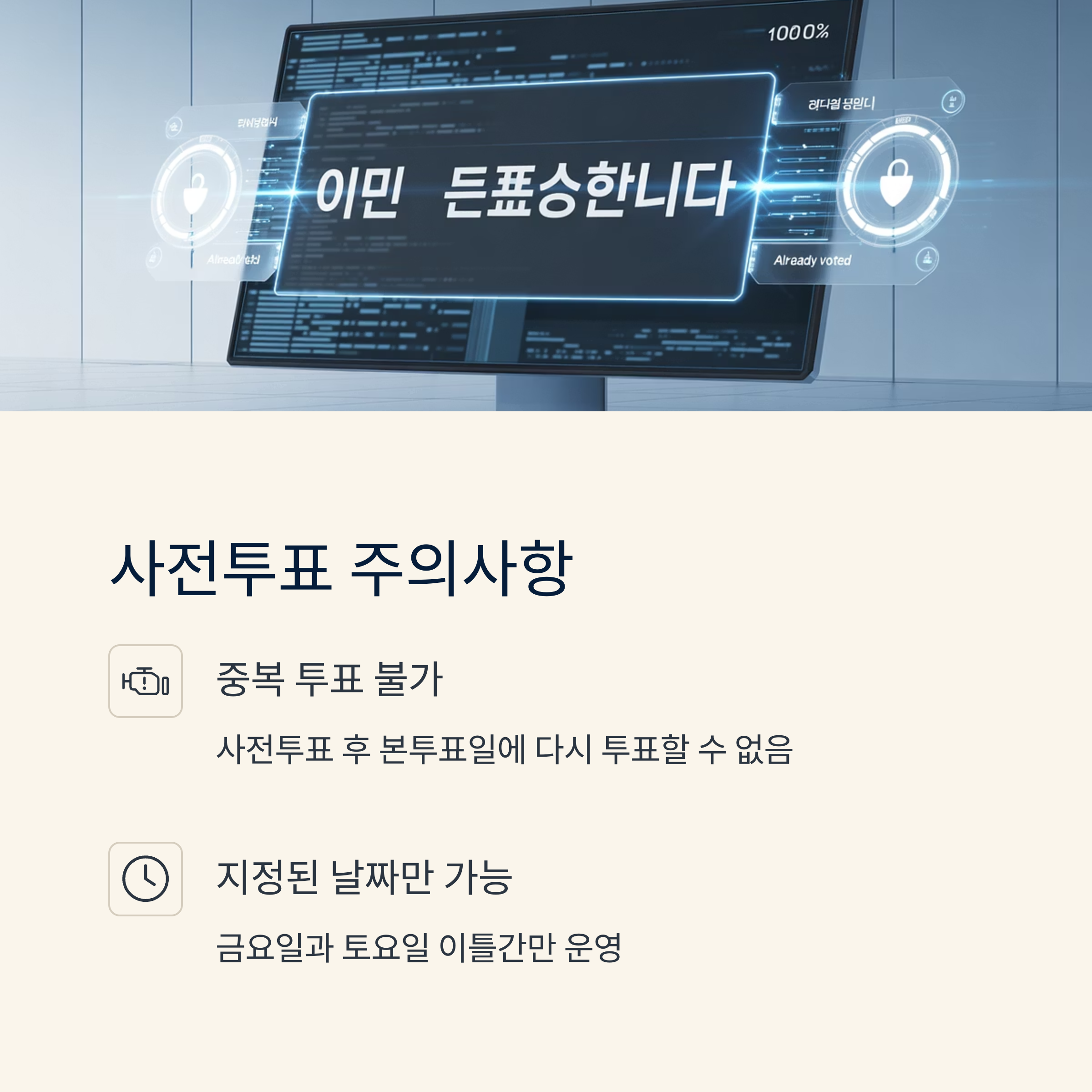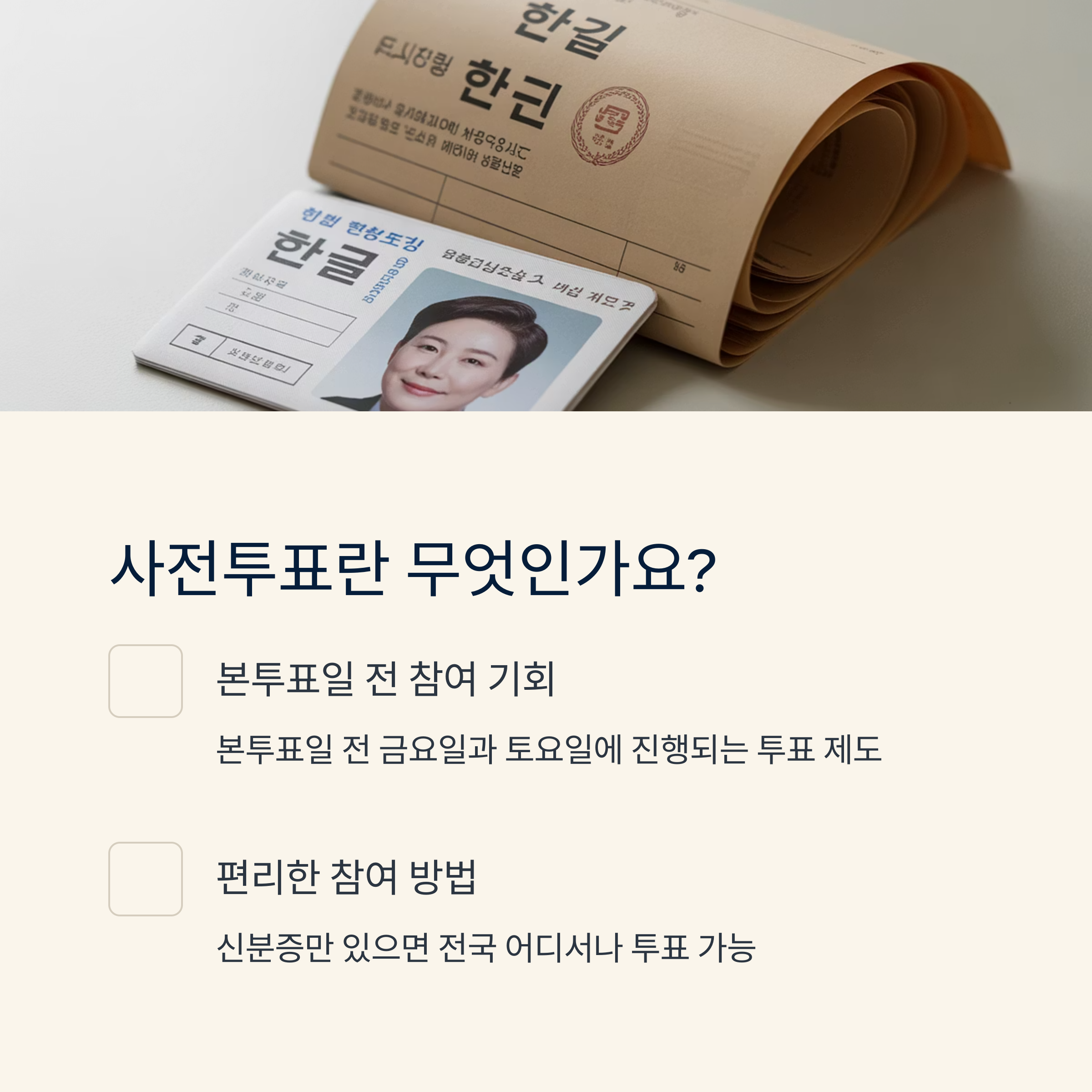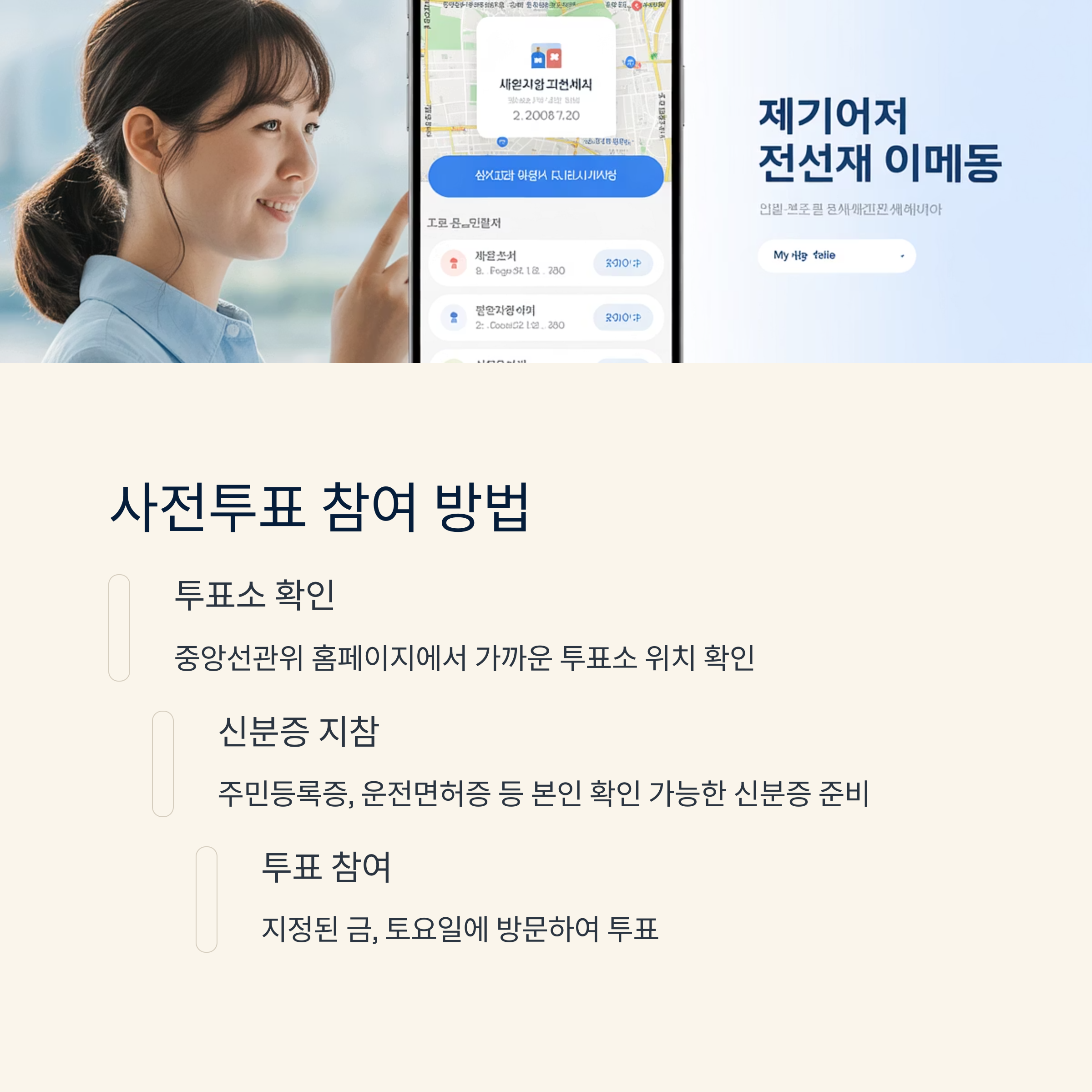 | 사전투표는 선거일 전 금, 토요일에 실시됩니다. | 중앙선관위 홈페이지 또는 모바일 앱에서 확인 가능 | 신분증 지참, 기표 방법 숙지 등 기본 사항 필수 |