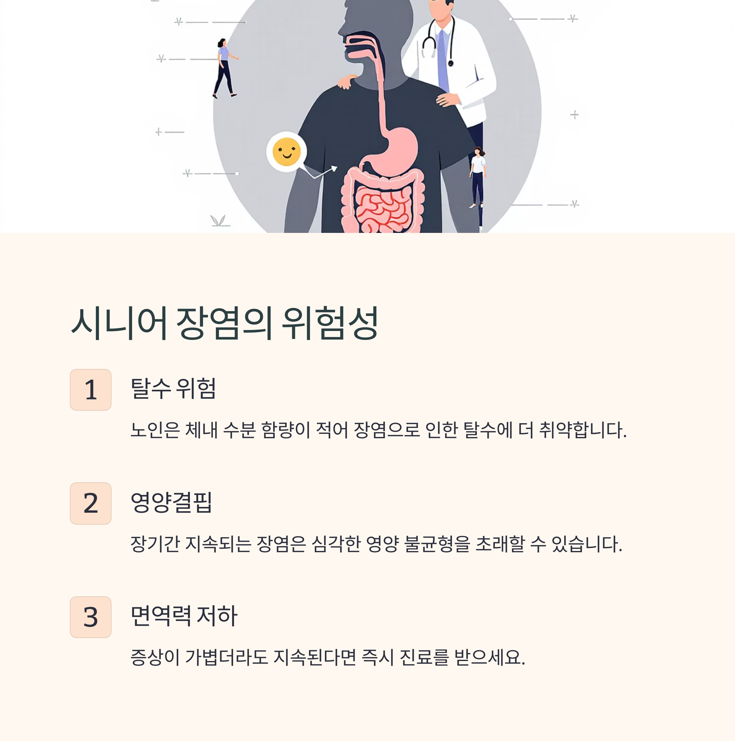 | 노년기 면역 저하로 감염 위험 더 커짐 | 일반 장염보다 증상이 약하고 오래 지속될 수 있음 | 정기검진과 식습관 개선으로 예방 가능 |