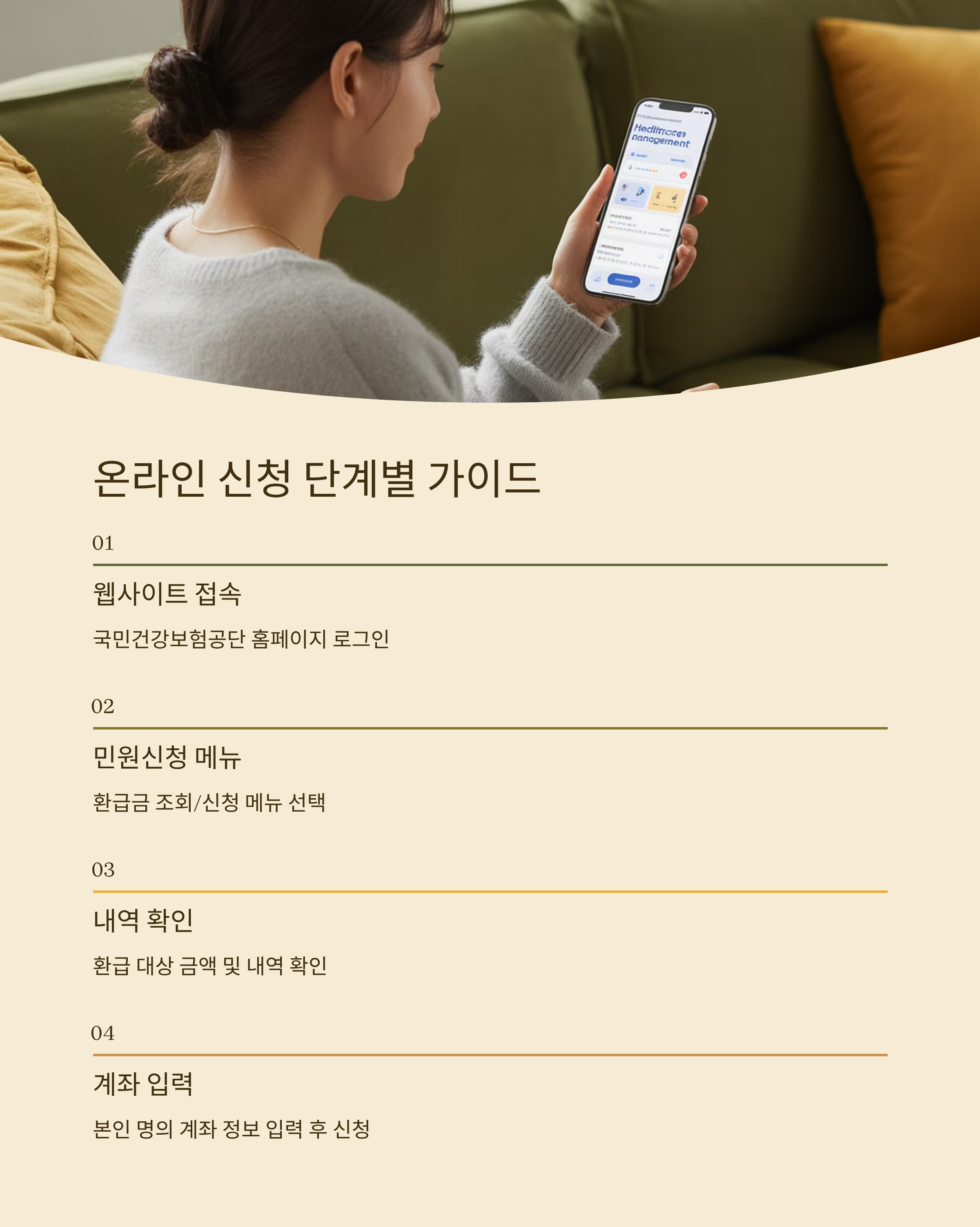 국민건강보험공단 홈페이지나 'The건강보험' 앱을 이용하면, 집에서도 간편하게 신청할 수 있습니다. 로그인 후, '민원신청' 메뉴에서 환급금을 조회하고 본인 계좌를 입력하면 끝! 저도 직접 해봤는데, 5분도 안 걸리더라고요.