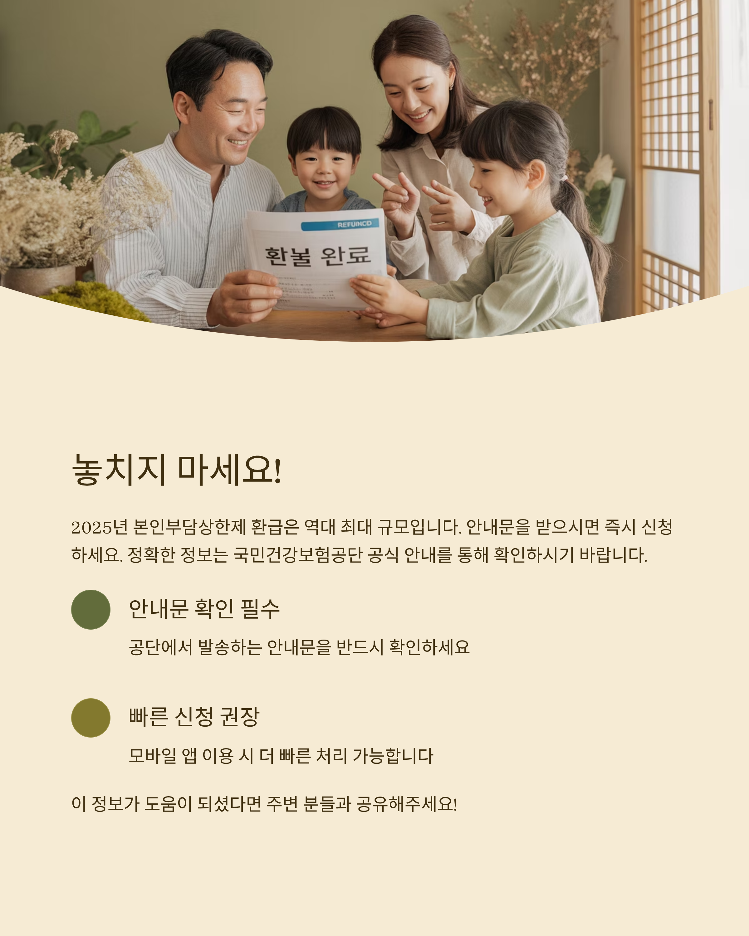 본인부담상한제는 국민들의 의료비 부담을 덜어주는 소중한 제도입니다. 환급 대상이 되는지 꼼꼼히 확인하고, 잊지 말고 꼭 신청해서 혜택을 받으시길 바랍니다.