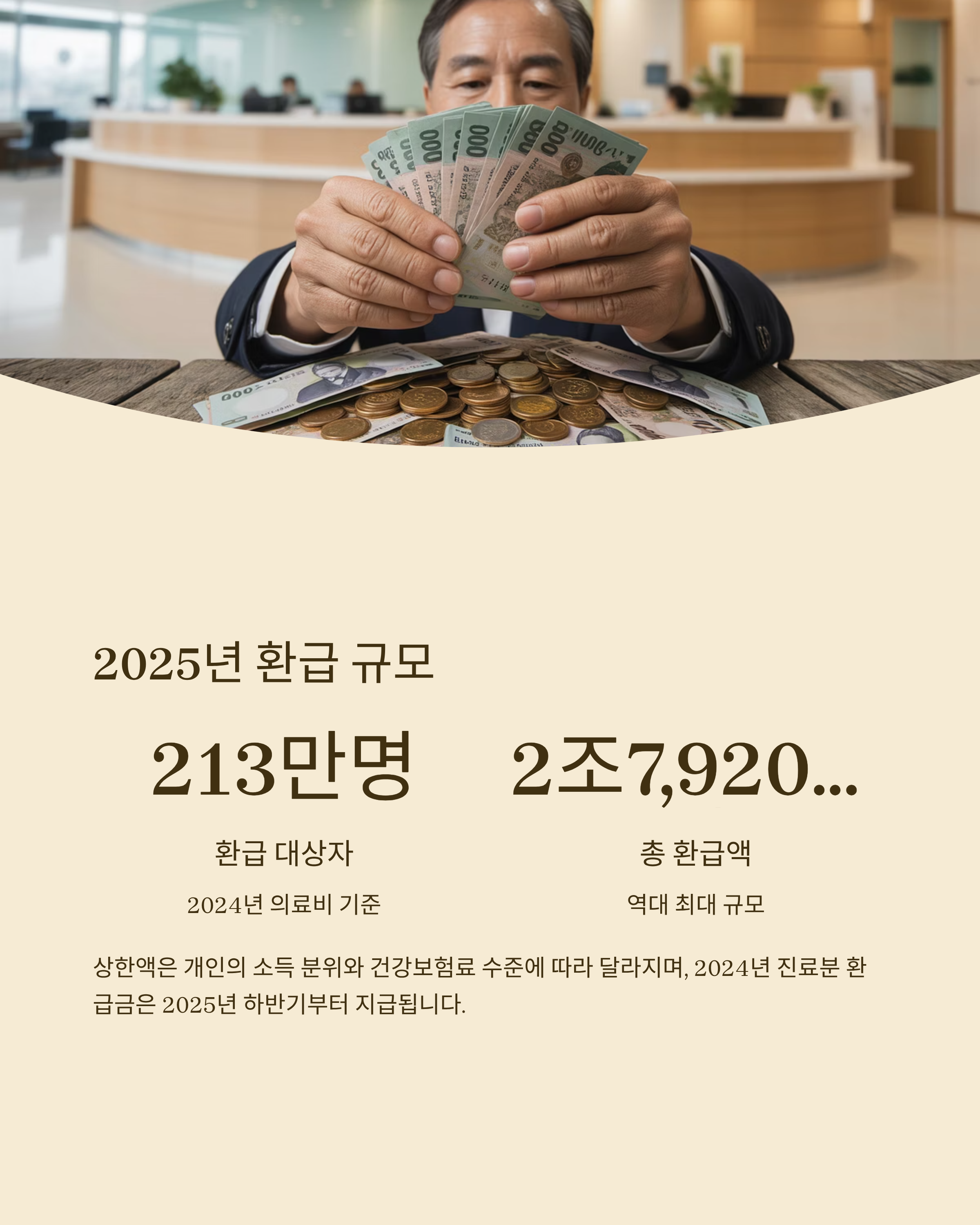 놀라운 사실은, 2024년 기준으로 무려 213만 명이나 되는 분들이 이 혜택을 받을 수 있다고 합니다. 총 환급액은 무려 2조 7,920억 원에 달할 것으로 예상된다고 하니, 정말 어마어마하죠? 이처럼 많은 분들이 제도를 통해 경제적 부담을 덜고 건강을 지킬 수 있게 되었습니다.