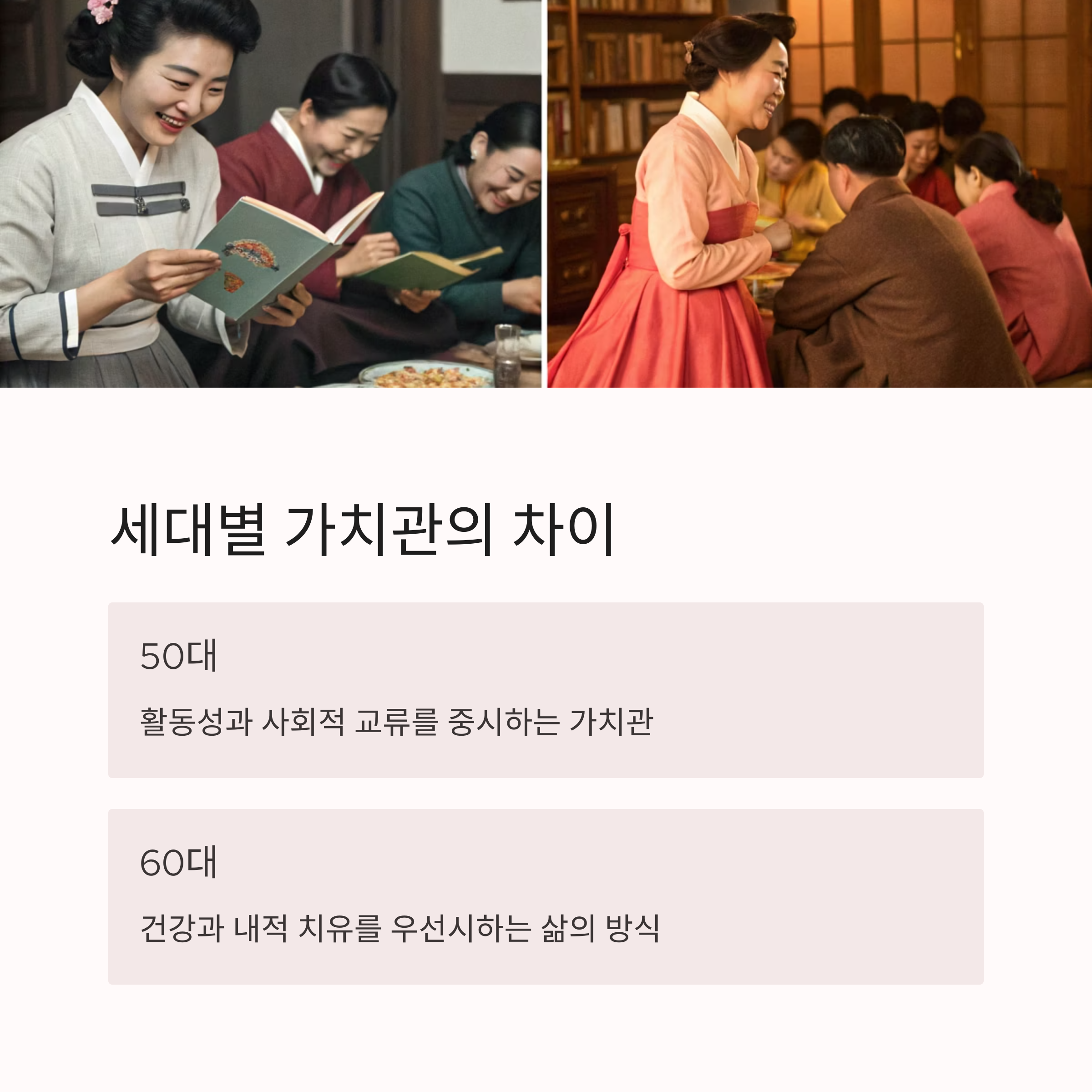 많은 분들이 "50대는 아직 활동적이고 사회와의 연결이 많은 시기"라고 느끼는 반면, 60대는 "조금 더 여유롭고 정적인 활동에 집중"하는 경향이 강하죠.