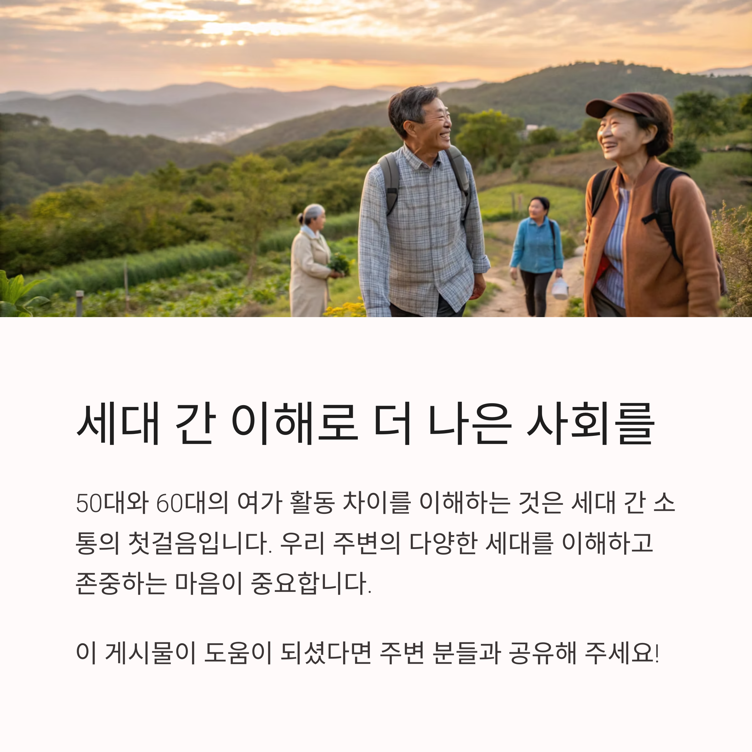 여러분은 어떤 여가활동을 즐기시나요? 50대와 60대의 여가 트렌드에 대해 공감되는 점이나 특별한 경험이 있다면 댓글로 함께 공유해주세요. 여러분의 이야기가 더 풍성한 콘텐츠를 만듭니다!
