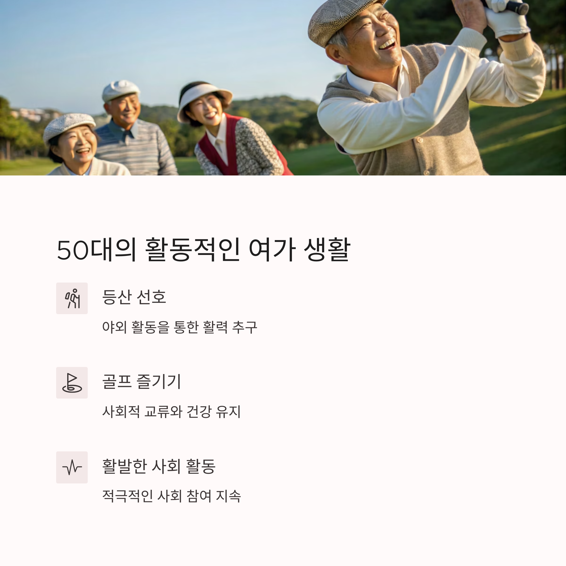 | 50대 여가특징 | 사회적 모임 및 야외 활동 비중이 높음 |