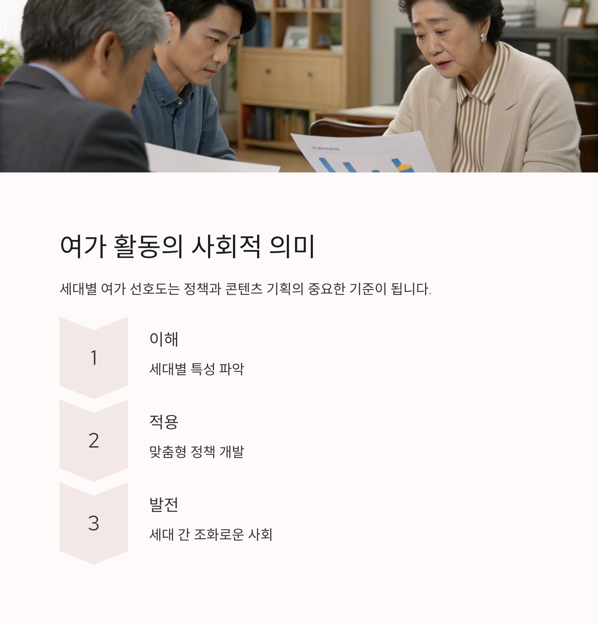 이처럼 여가활동은 각 세대가 어떤 삶의 단계를 지나고 있는지를 명확하게 보여주는 척도이자, 개인의 삶의 질을 가늠할 수 있는 중요한 지표라 할 수 있습니다.